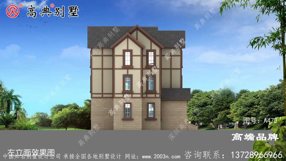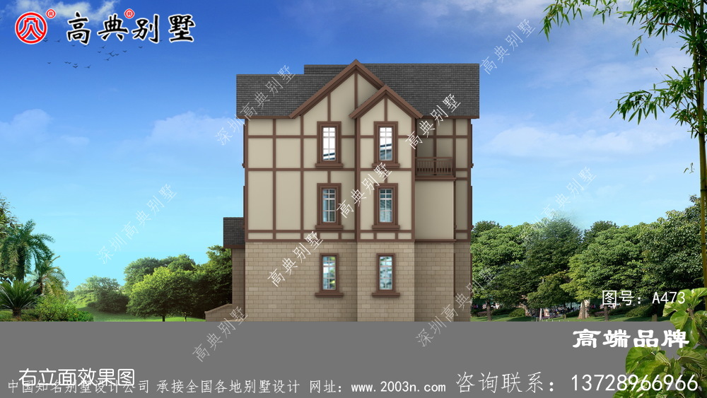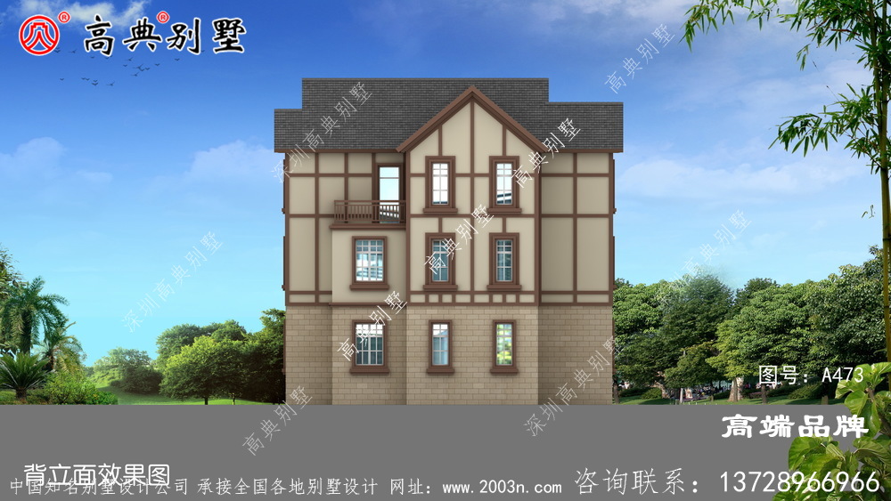 A473号别墅外墙主要材料:真石漆、水泥构件墙面装饰线条、劈开砖、铁艺栏杆、屋面水泥平板瓦