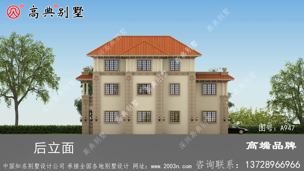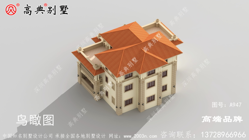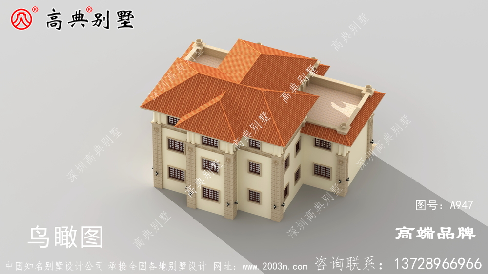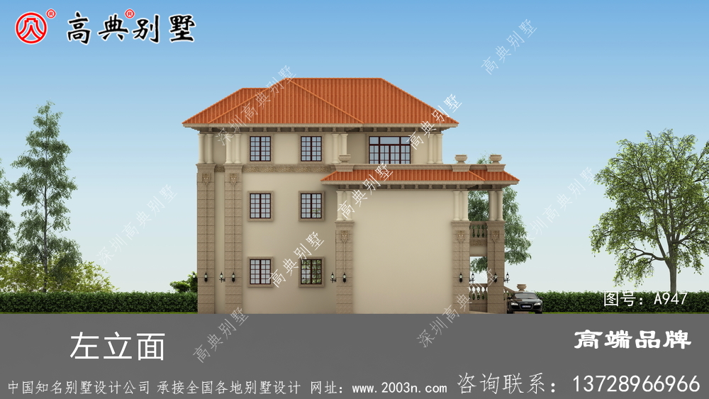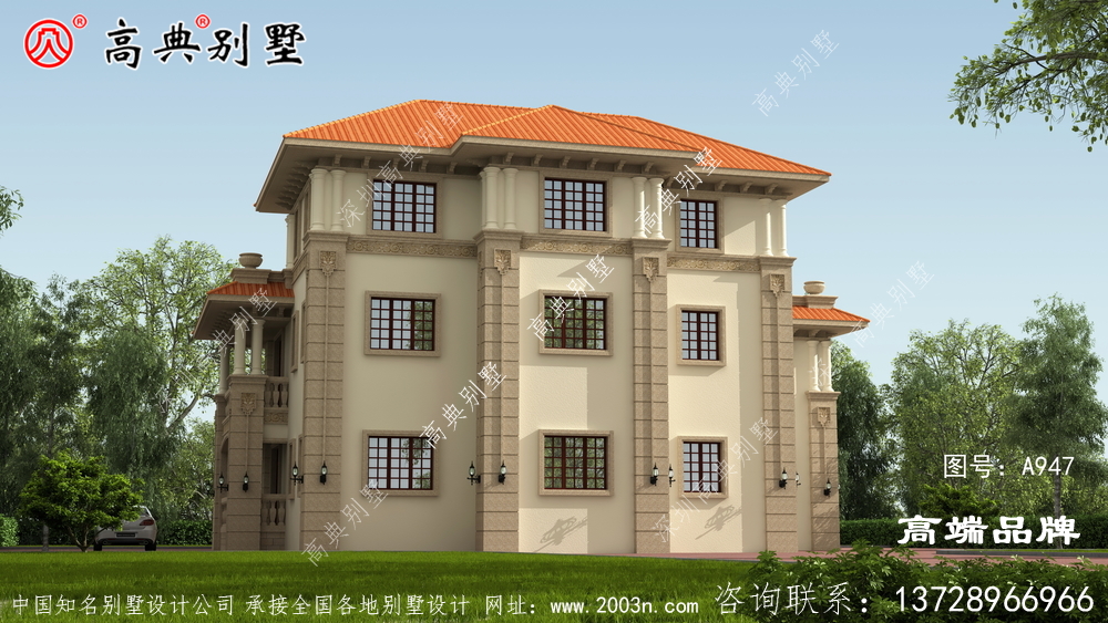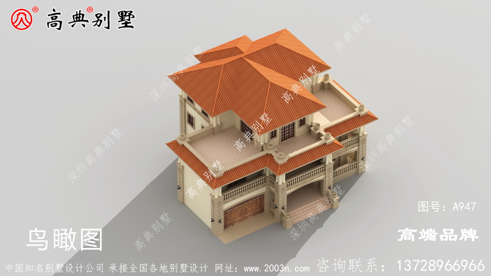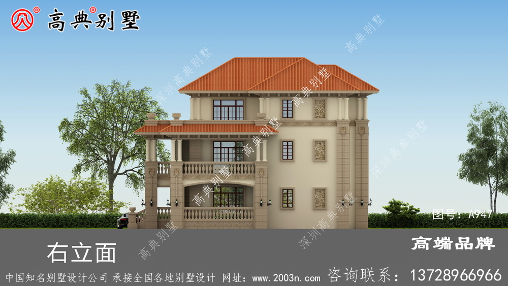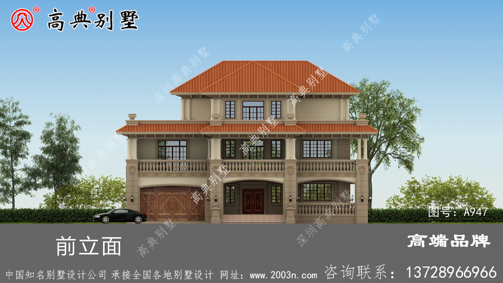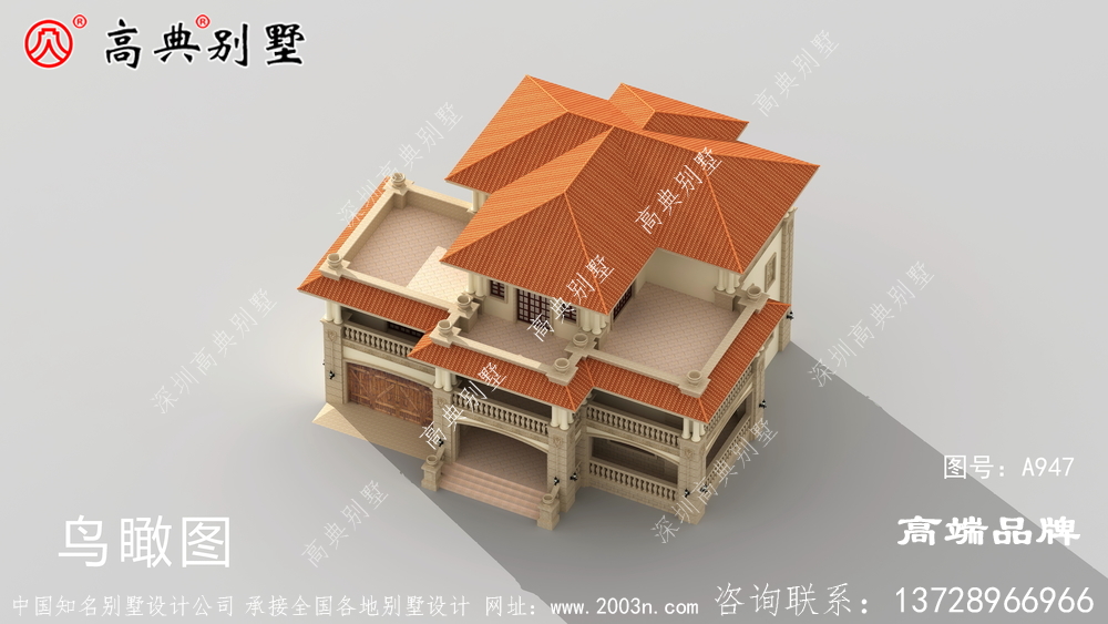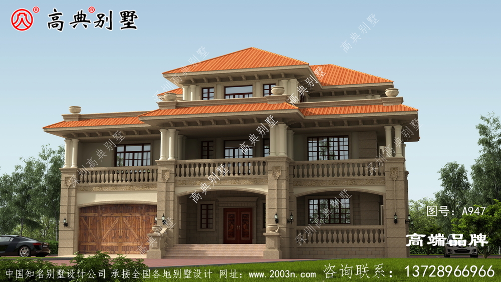 A947号别墅外墙主要材料:真石漆、310X310S瓦、面贴荔枝面黄锈石、外墙砖、葫芦柱栏杆、水泥构件