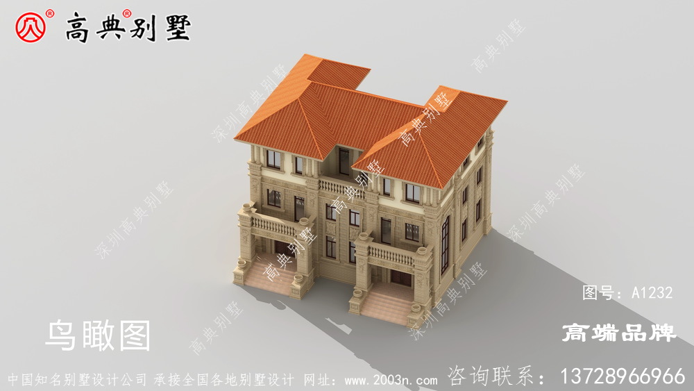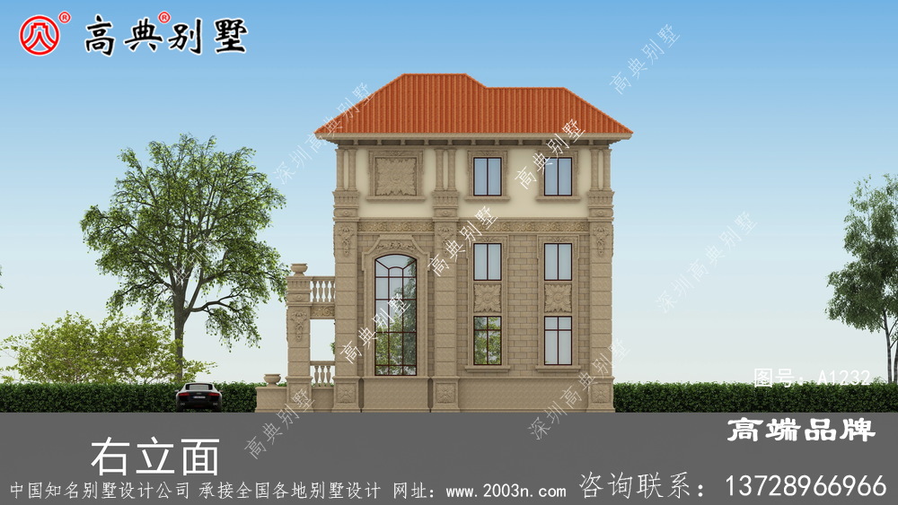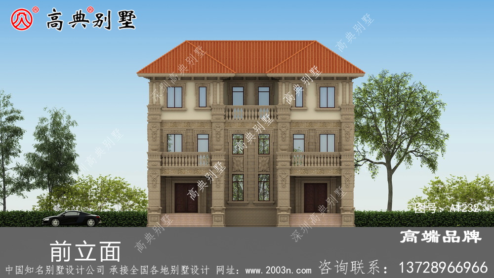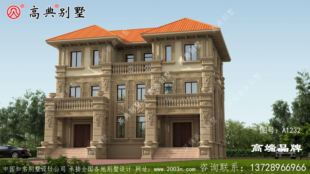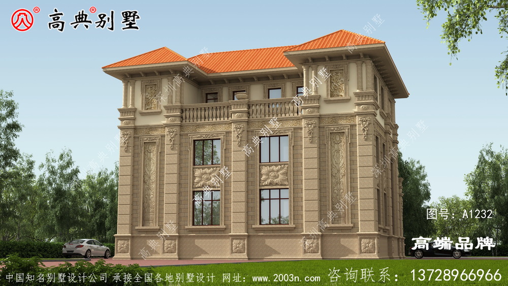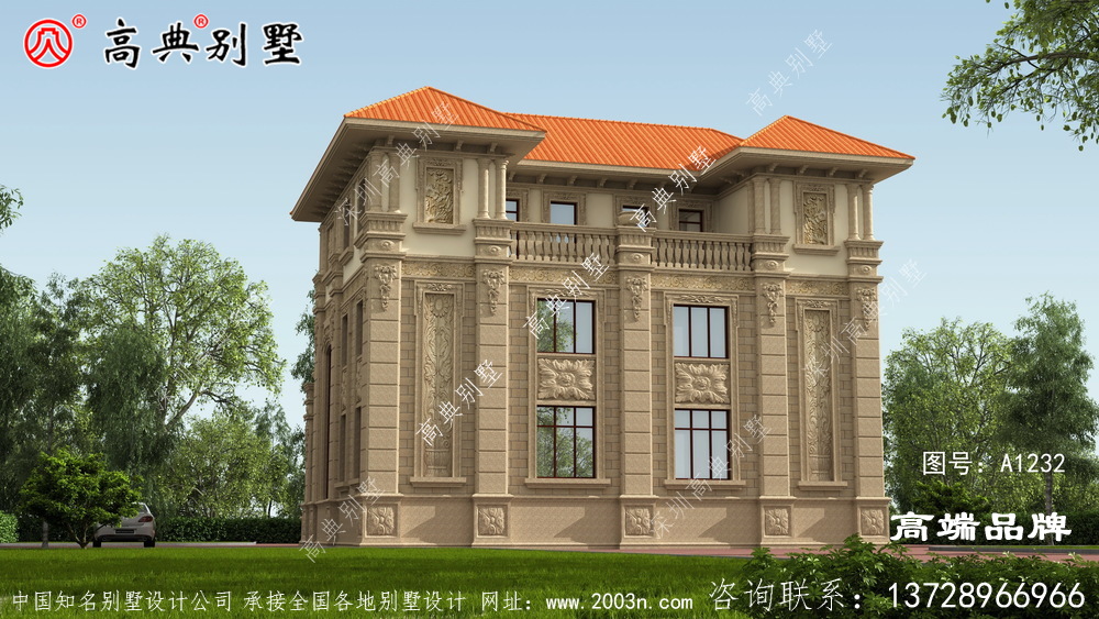 A1232号别墅外墙材料:水泥构件、真石漆、310X310S瓦、外墙砖