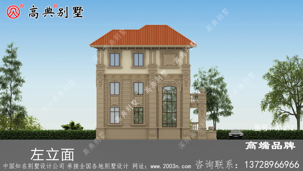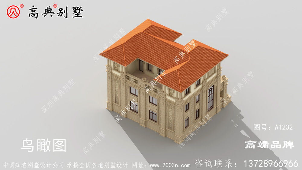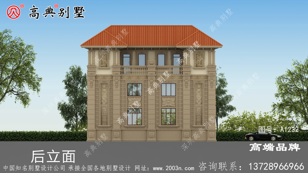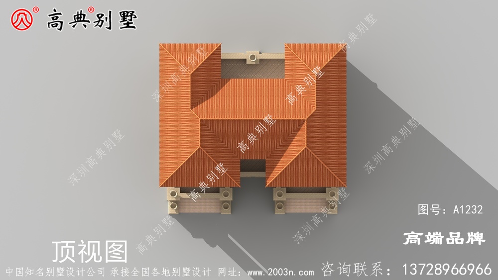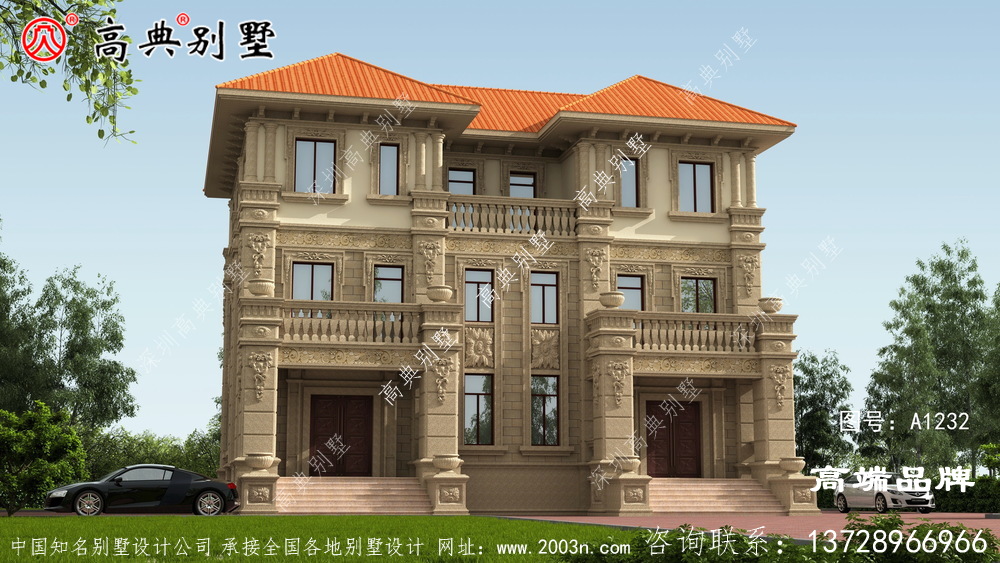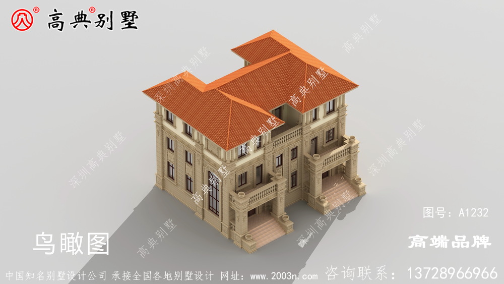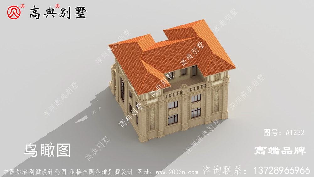 A1232号别墅外墙材料:水泥构件、真石漆、310X310S瓦、外墙砖