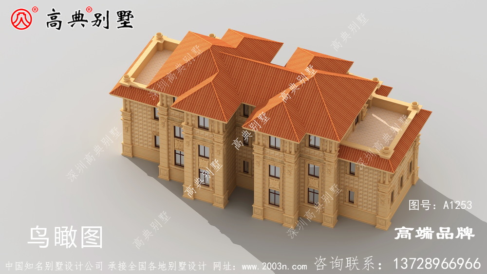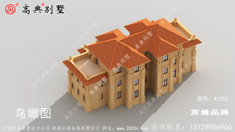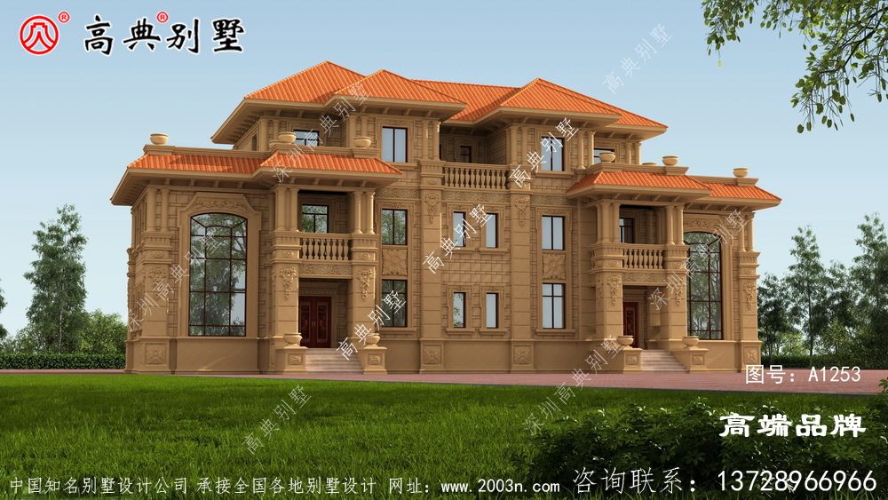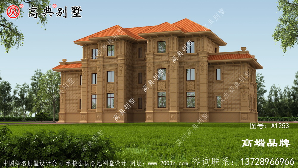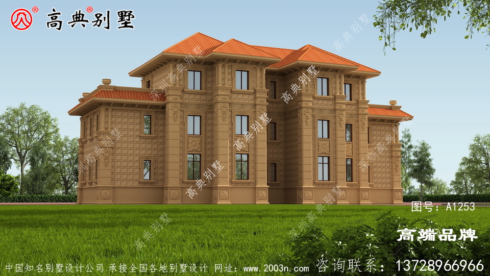 A1253号别墅外墙材料:水泥构件、真石漆、310X310S瓦、外墙砖