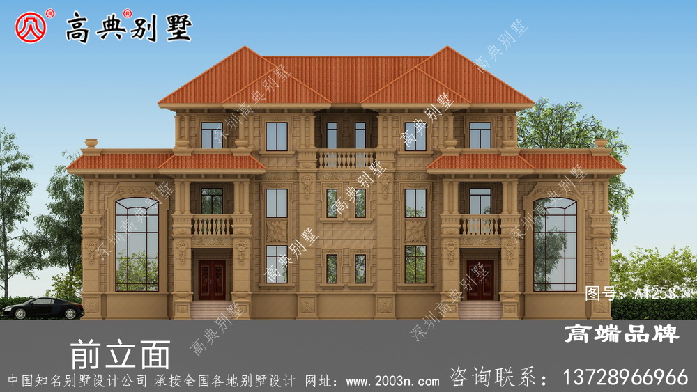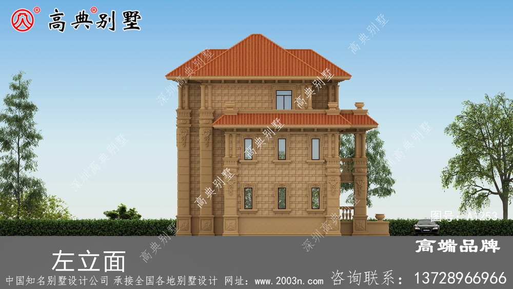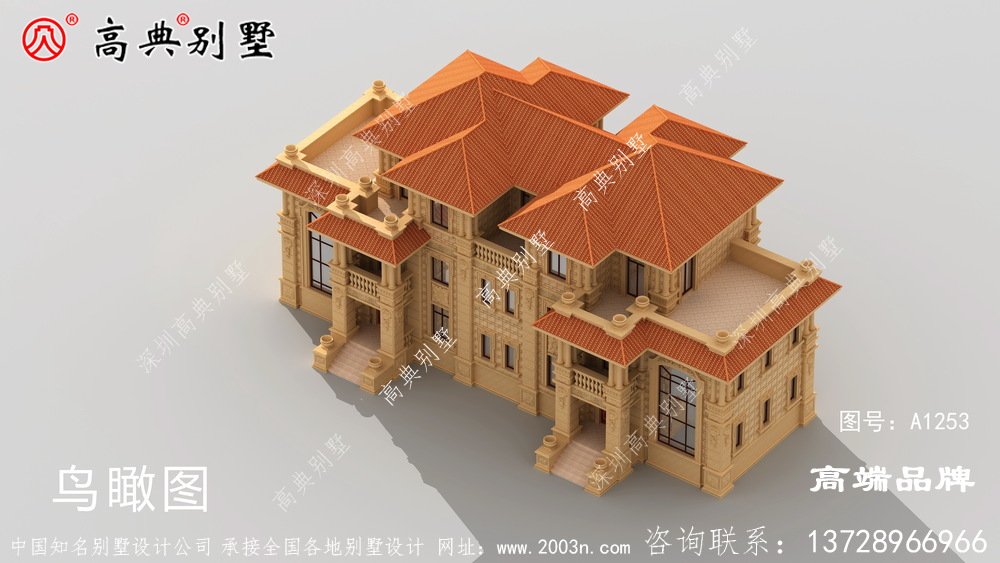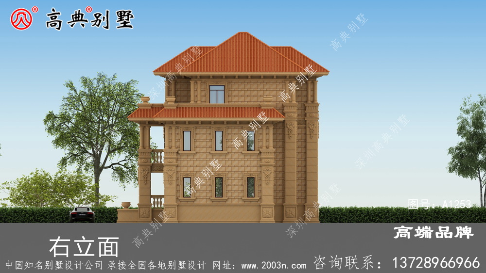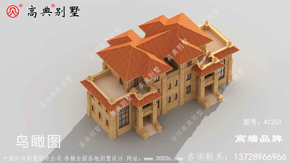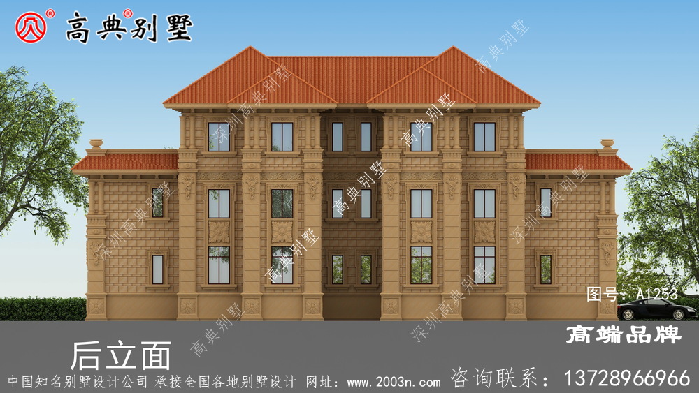 A1253号别墅外墙材料:水泥构件、真石漆、310X310S瓦、外墙砖