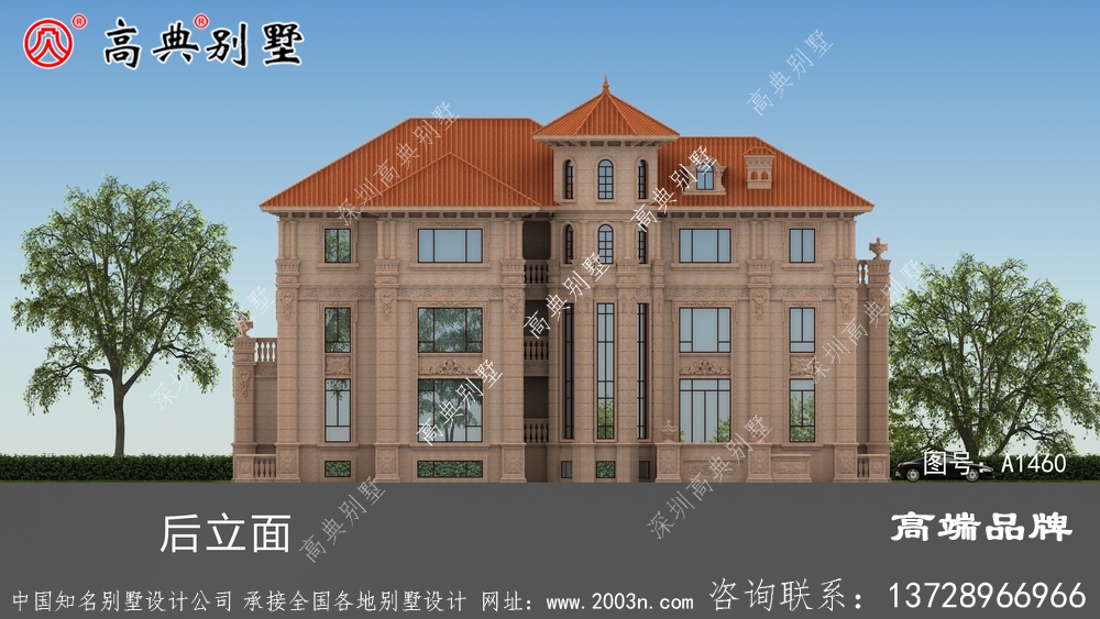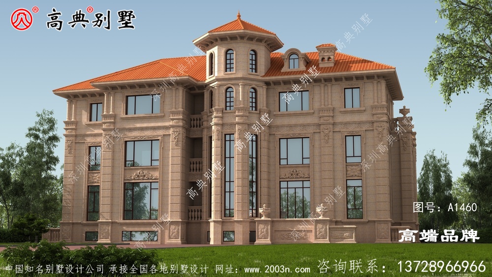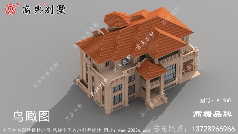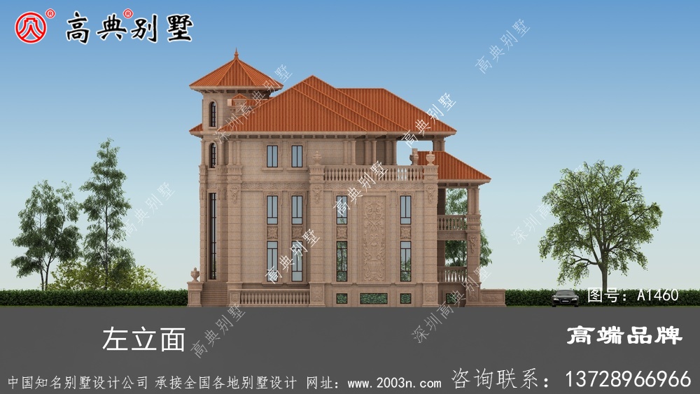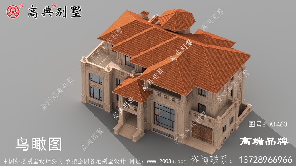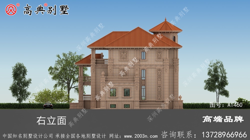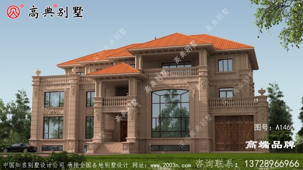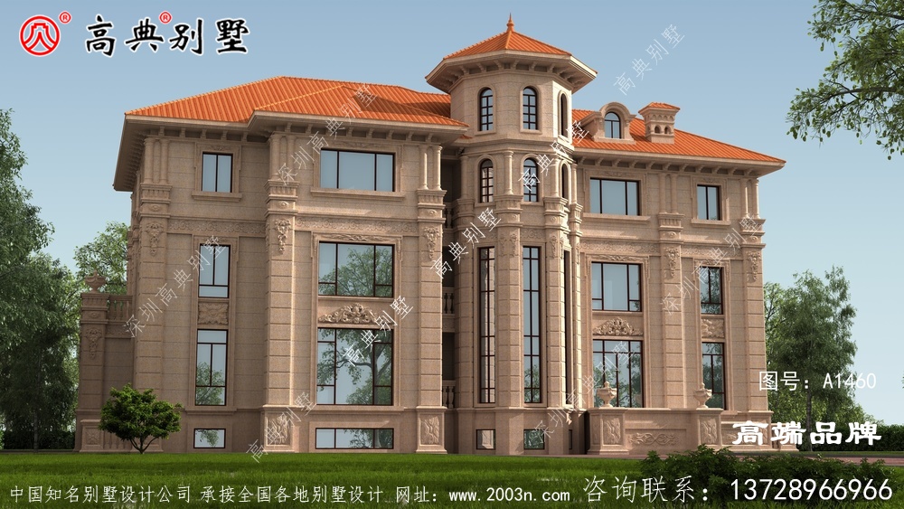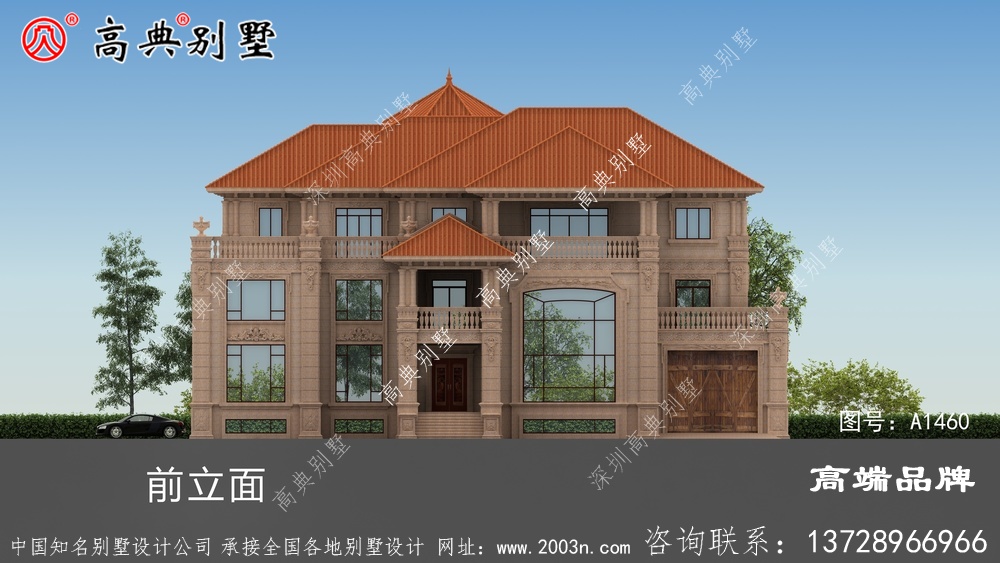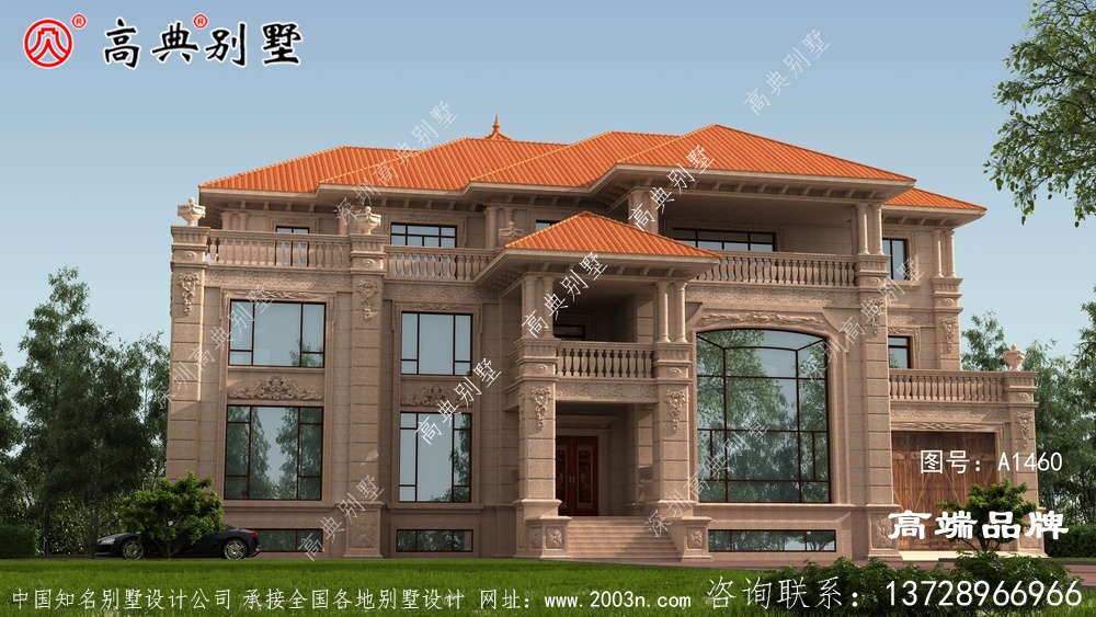 A1460号别墅外墙主要材料:荔枝面永定红石材、石材雕刻、310X310S瓦