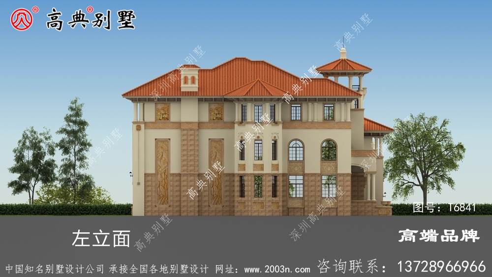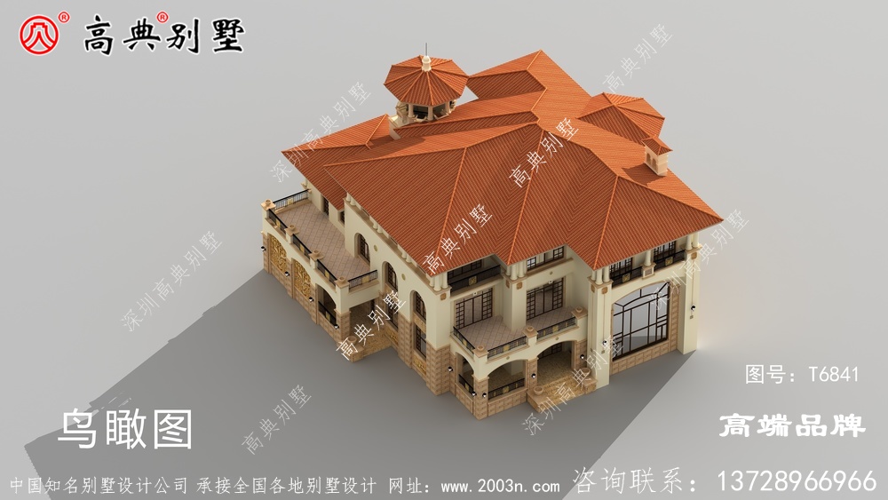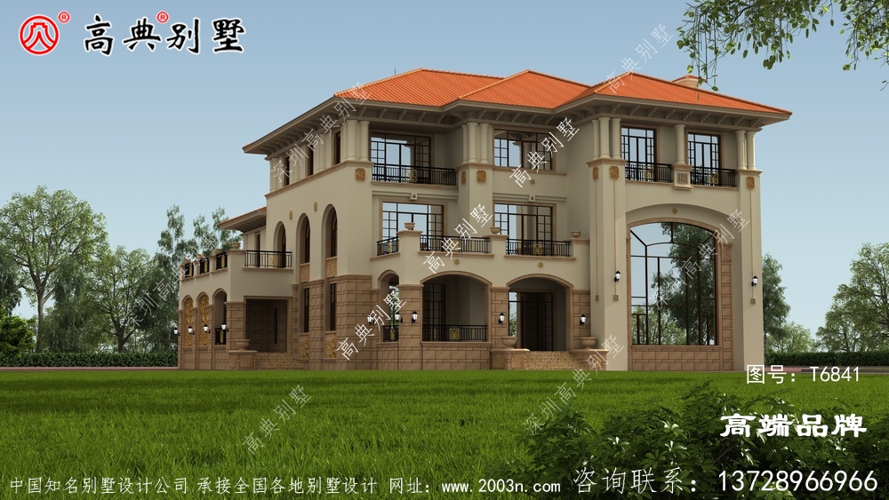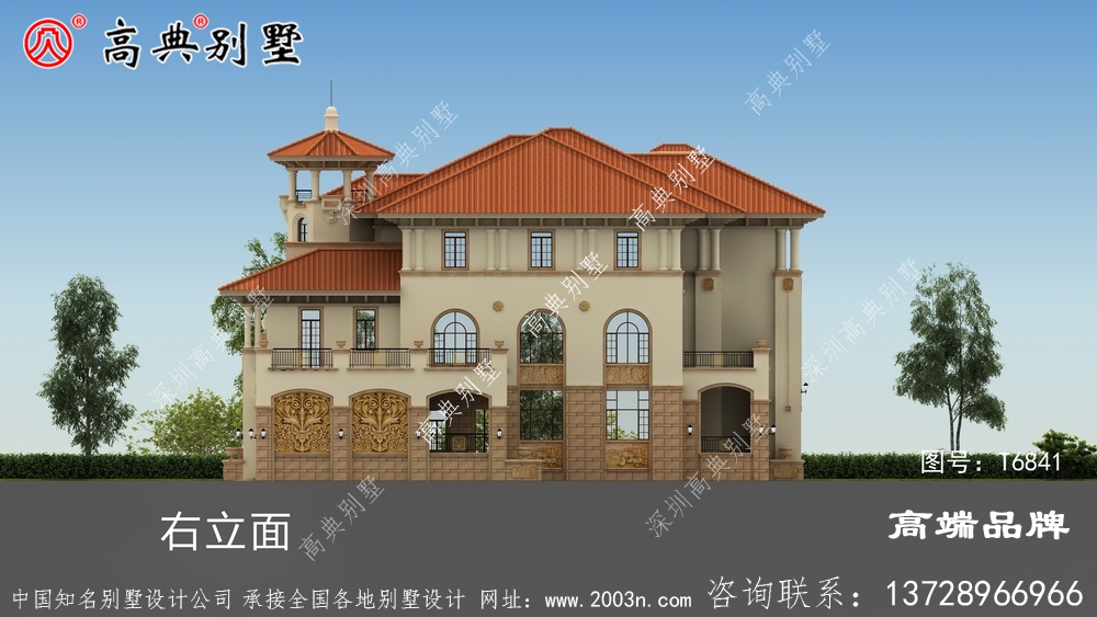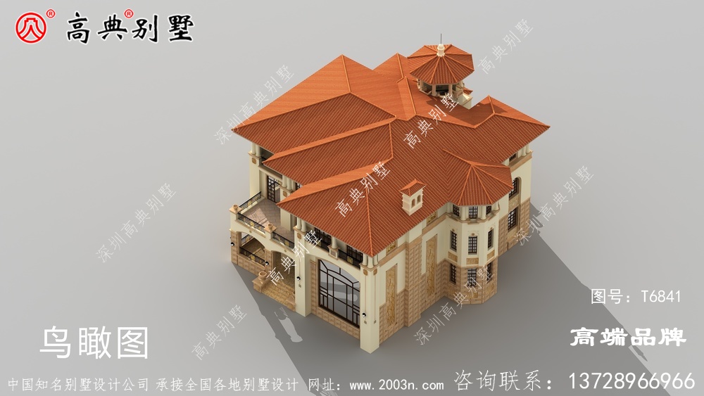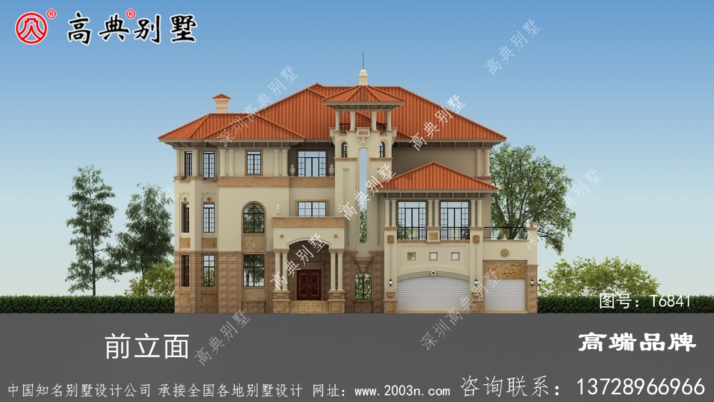 T6841号别墅外墙主要材料:砂岩石、真石漆、310X310S瓦、铁艺栏杆