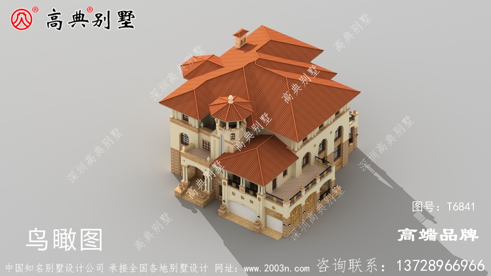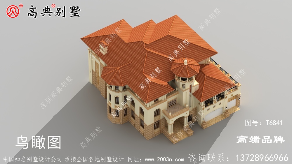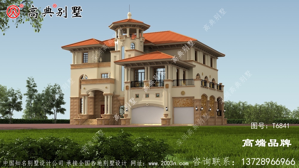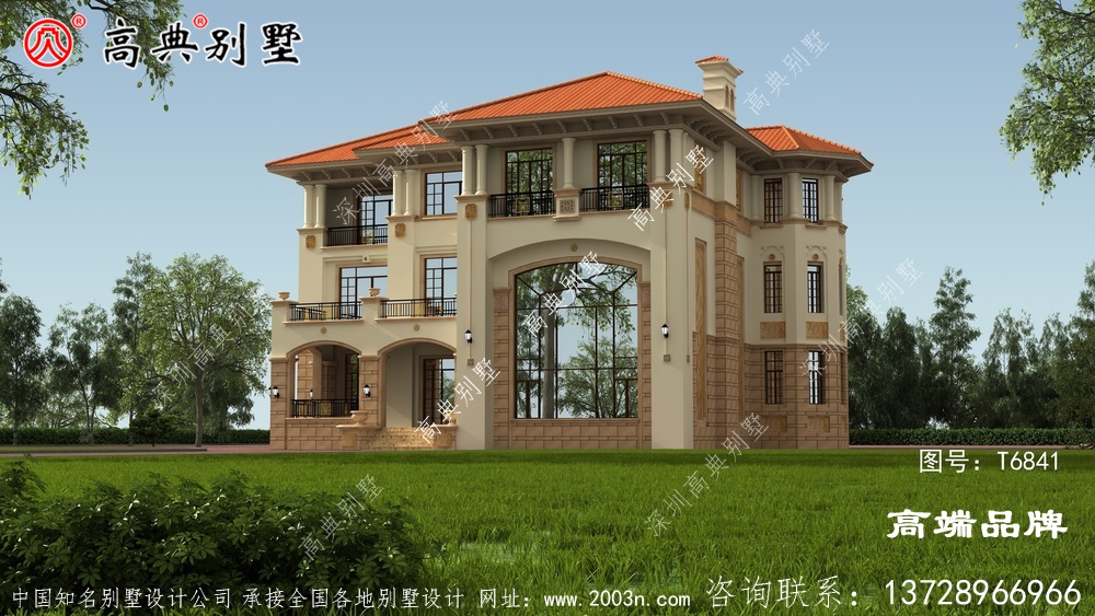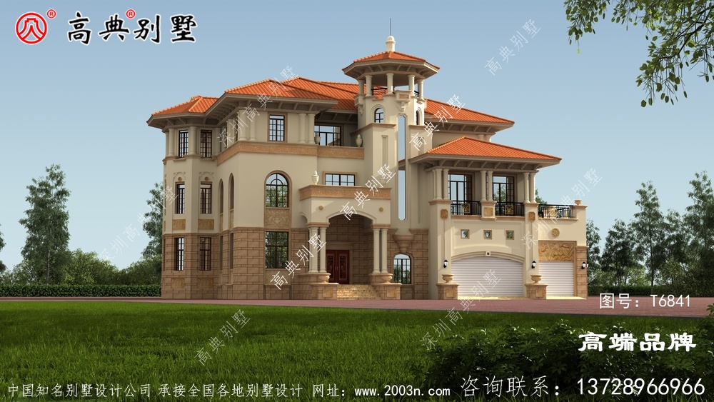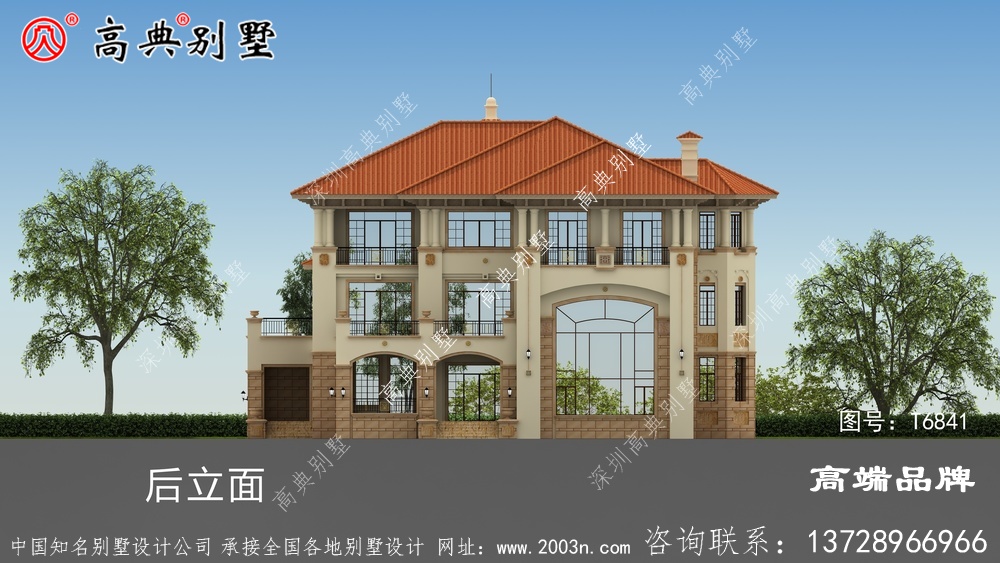 T6841号别墅外墙主要材料:砂岩石、真石漆、310X310S瓦、铁艺栏杆