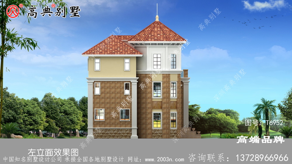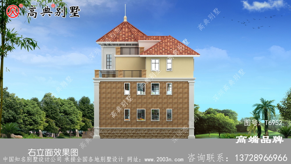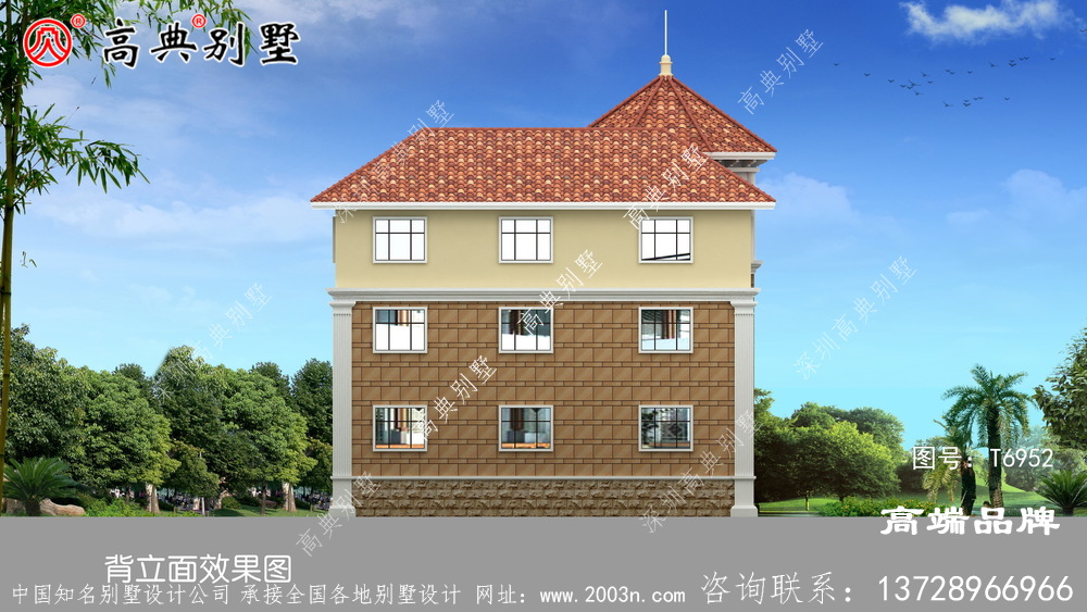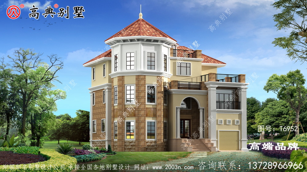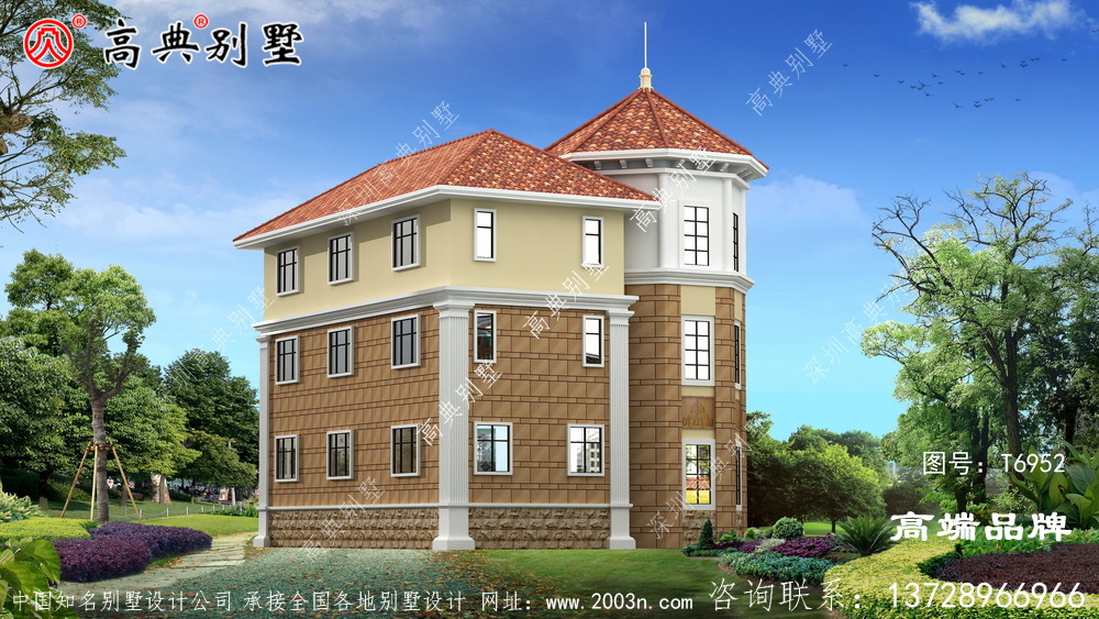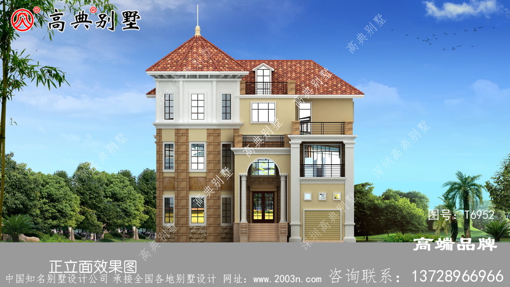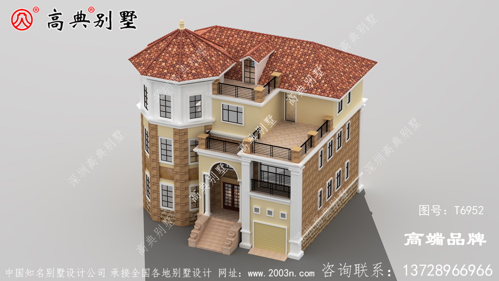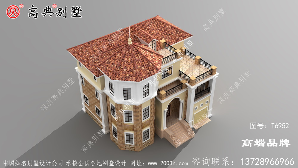 t6952号别墅外墙主要建筑材料:天然岩石漆、天然砂岩石、天然砂岩石浮雕、墙裙蘑菇石、310X310 S瓦、GRC水泥构件、铁艺栏杆