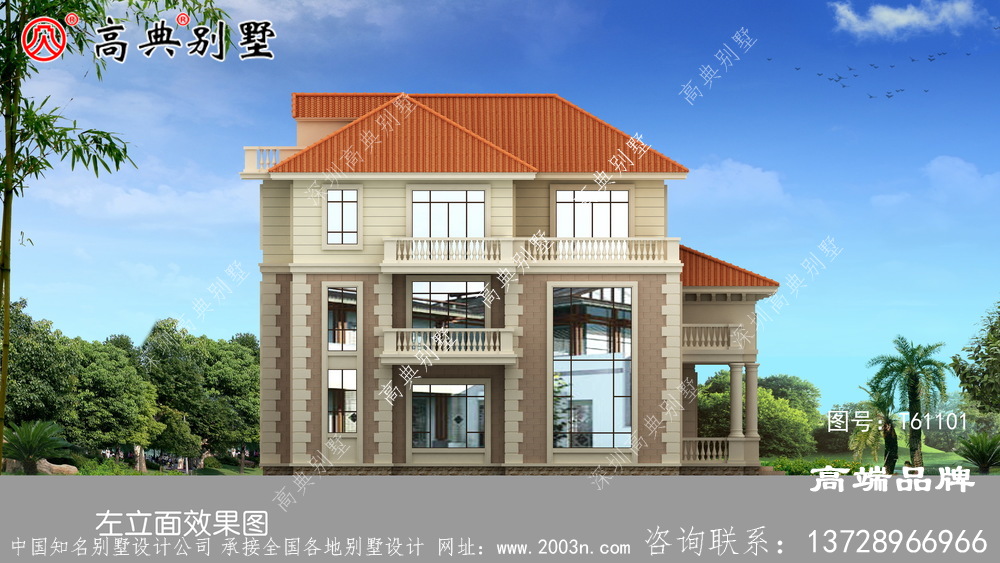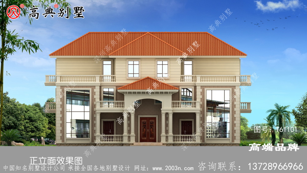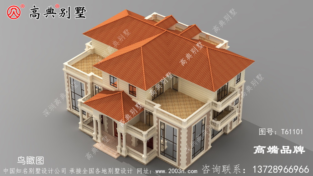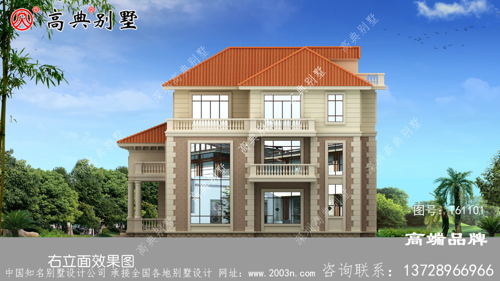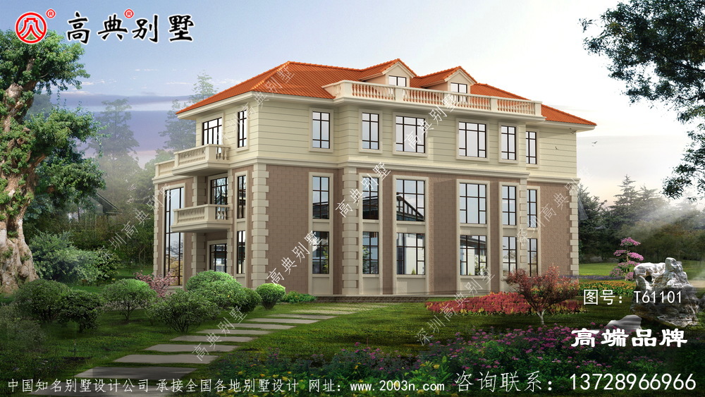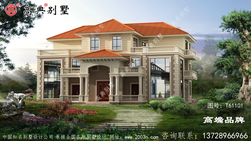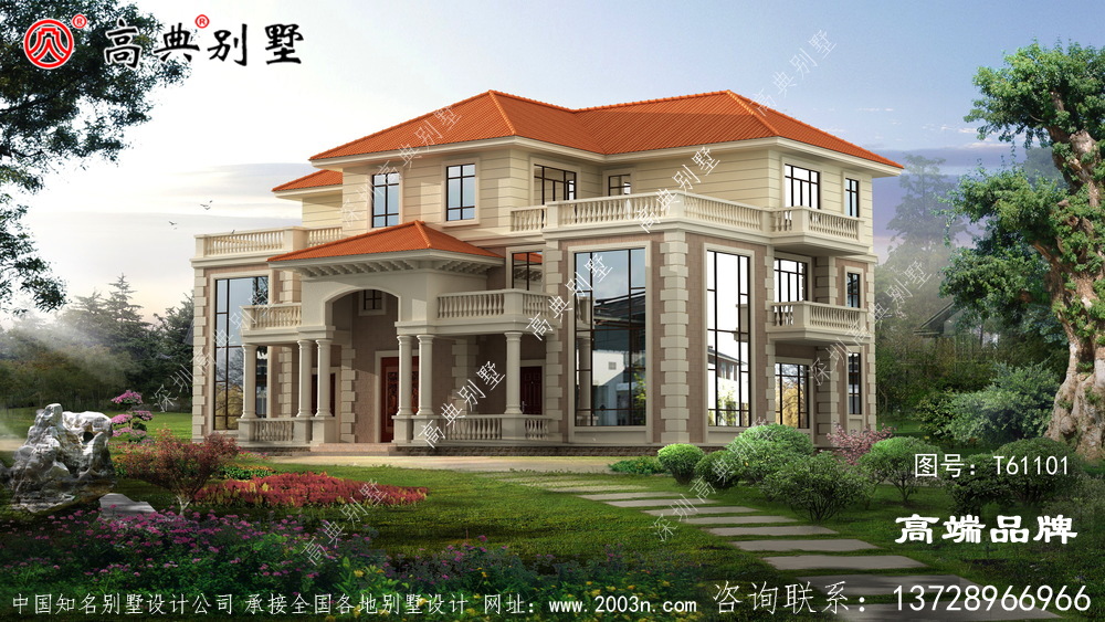 t61101号别墅外墙主要材料:外墙真石漆、仿石材外墙砖、S瓦、GRC水泥葫芦柱、GRC构件包边、蘑菇石